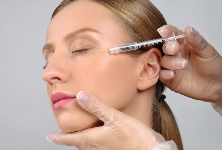 Woman is getting botox injection. Anti-aging treatment and face lift. Cosmetic Treatment. Facial skin lifting injection to woman's face. Plastic Surgery